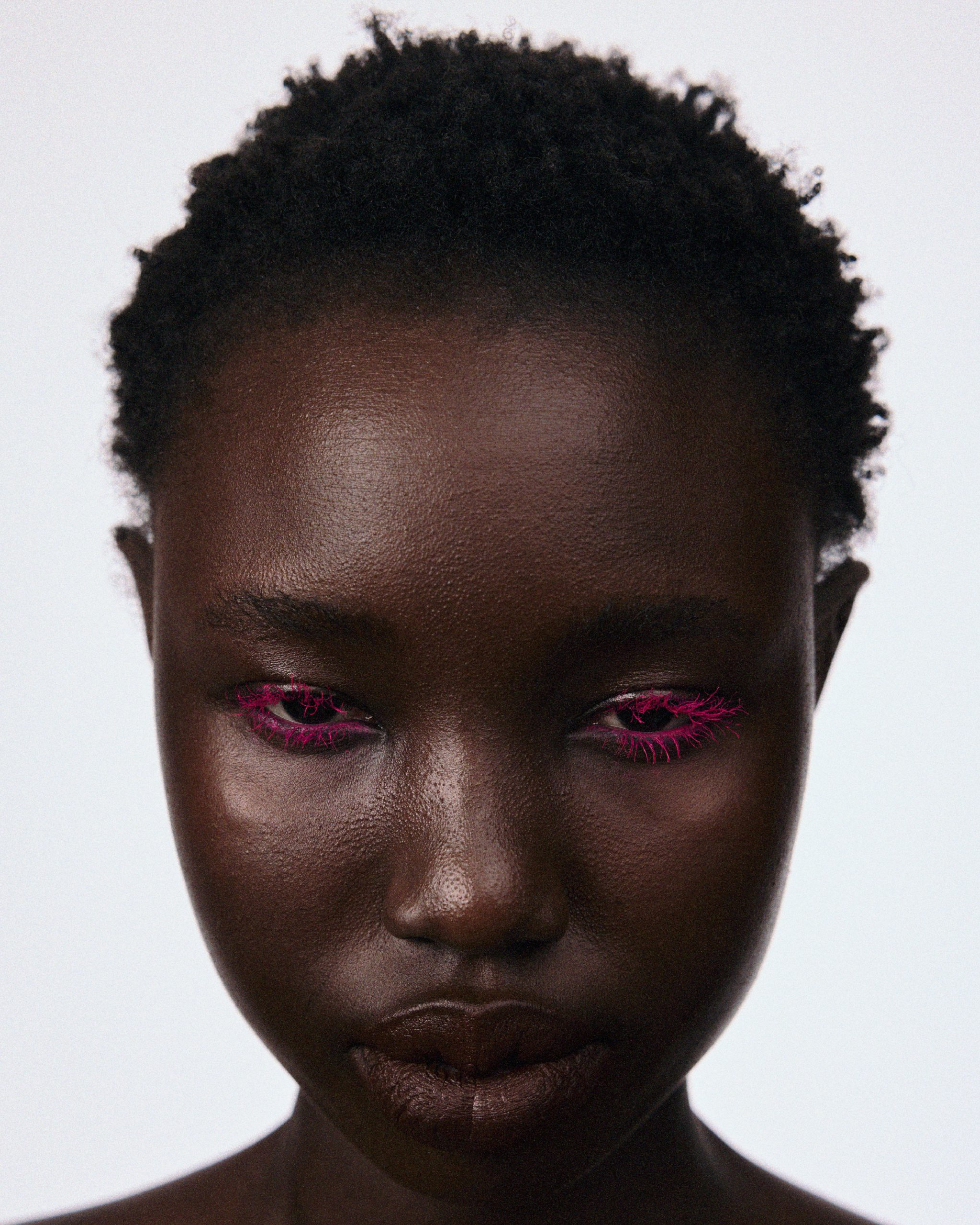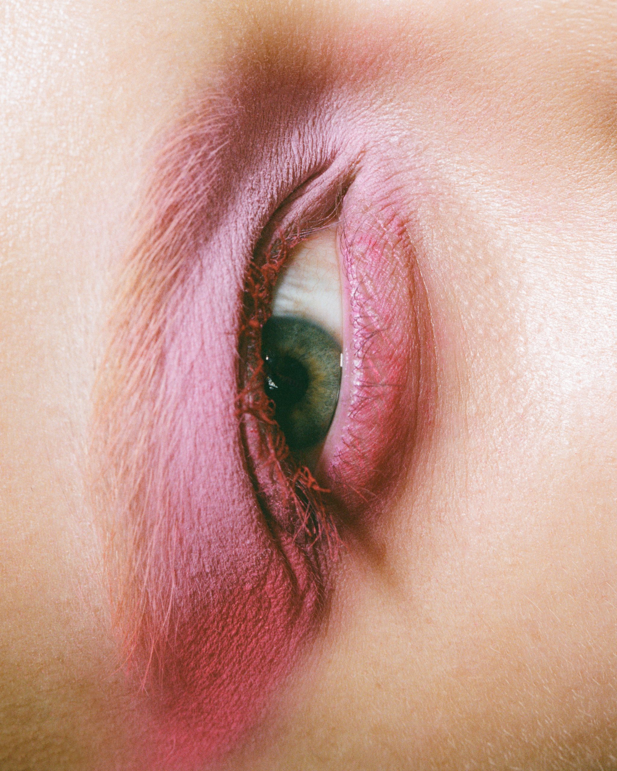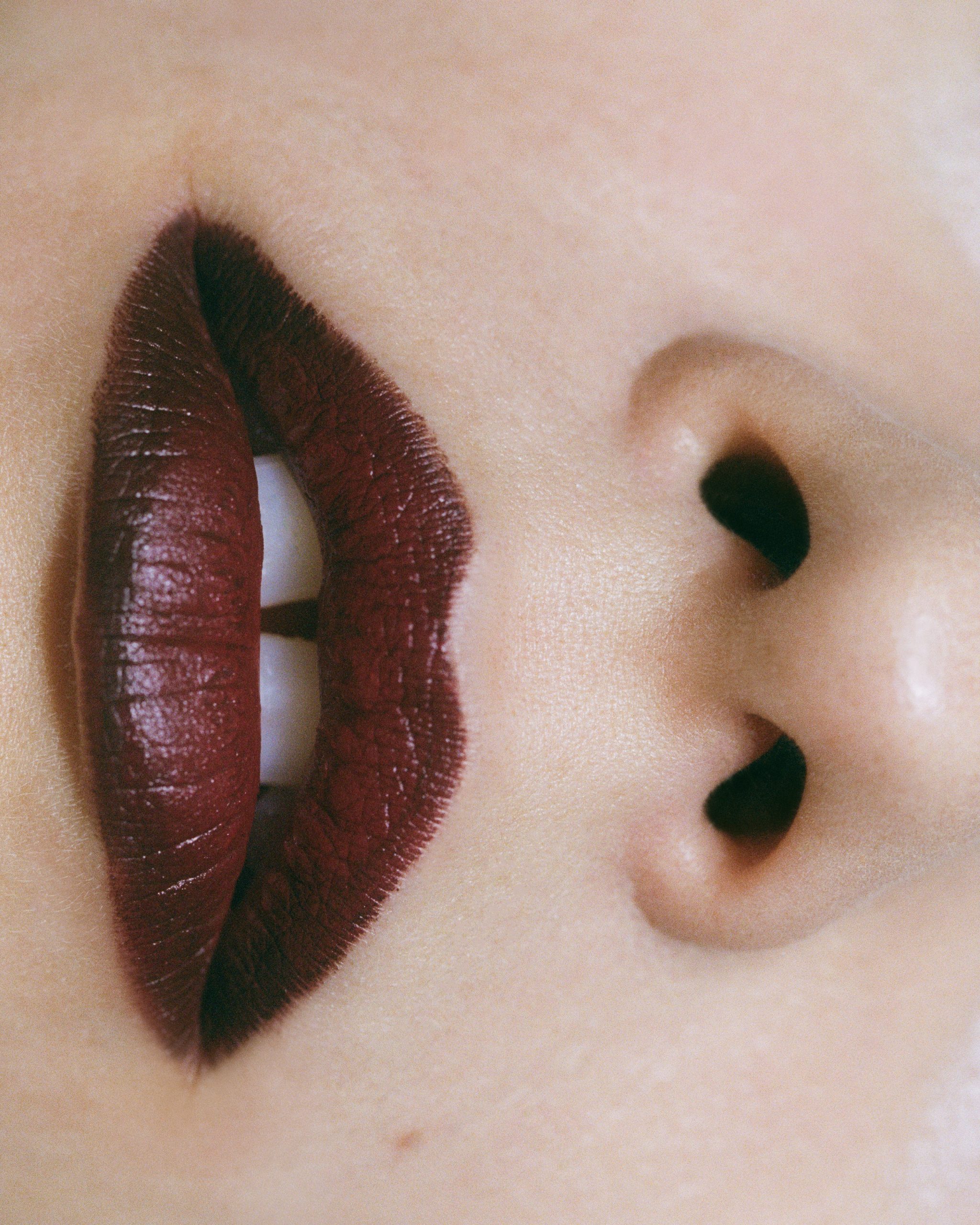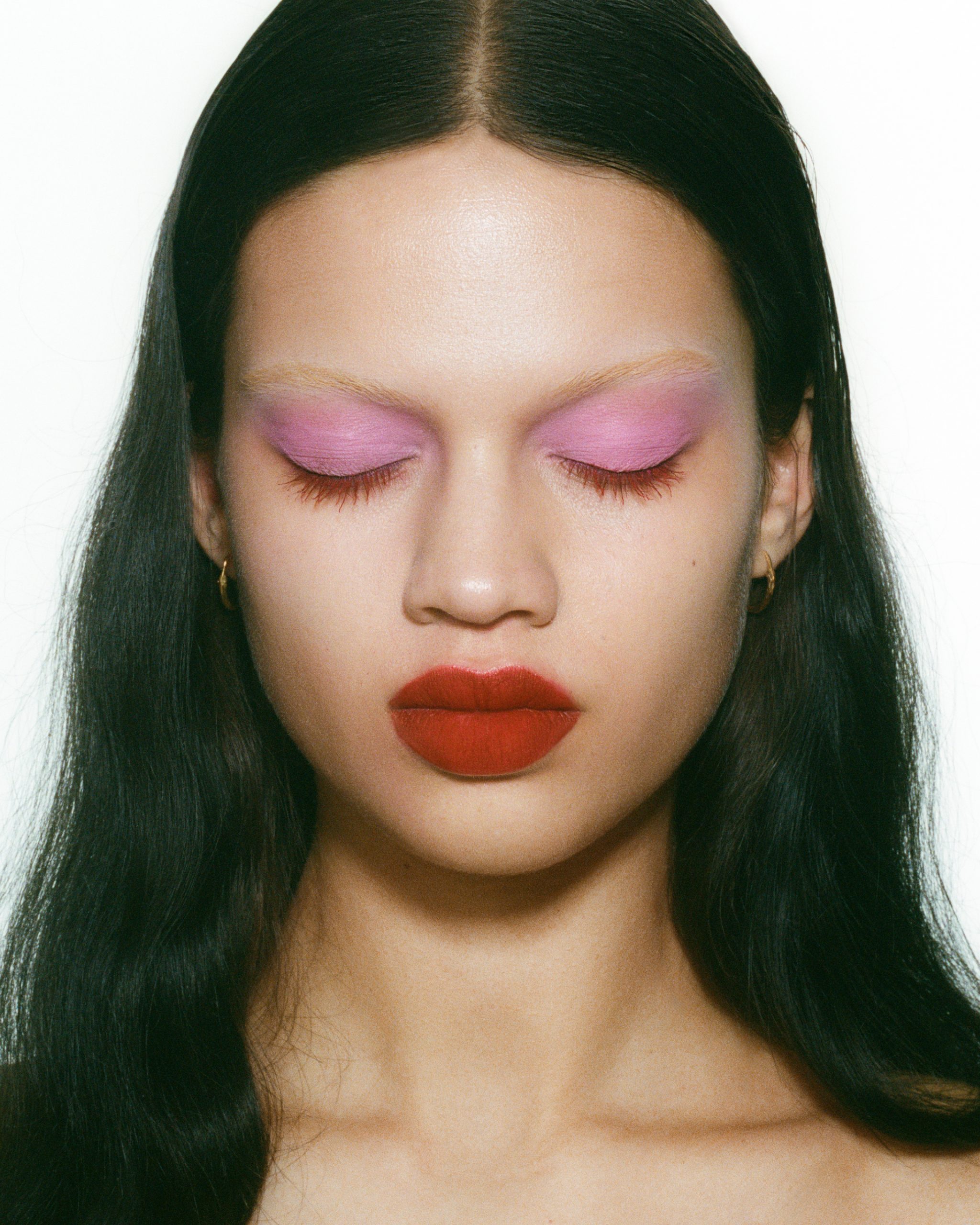In the exclusive editorial „Surface Tension“, photographed by Lotte Thor with hair and makeup by Viktoria Plekhanova, beauty is stripped of its finish. Cracked lipstick, dissolving glitter, and raw pigment become texture rather than adornment, dense, tactile, and resistant. Deep reds, hot pinks, and near-blacks pull the images into something closer to material than cosmetic.